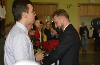 Dyrektor Magdalena Mielczarek krótko przypomniała historię "Adamusa". Podziękowała osobom, dzięki którym teatr powstał i mógł się rozwijać. Wręczyła bukiet kwiatów Maciejowi Kostyk - pomysłodawcy oraz Irenie Krzyszkiewcz - ówczesnej dyrektor szkoły.