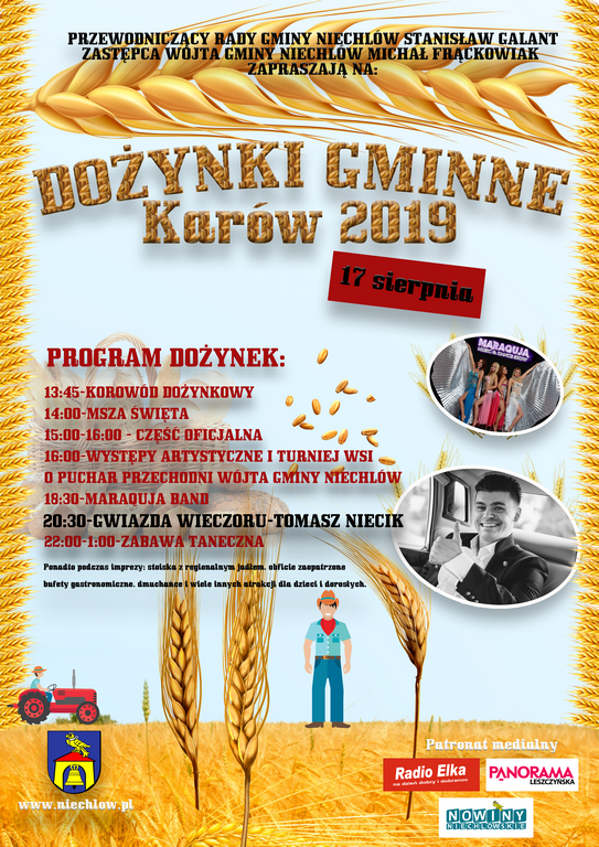 Dożynki w Gminie Niechlów zbliżają się wielkimi krokami. Tegoroczne Święto Plonów odbędzie się w Karowie na boisku sportowym. Gwiazdą wieczoru będzie Tomasz Niecik.