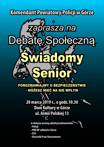 20 marca o godzinie 10:30 odbędzie się debata społeczna pod nazwą ,,Świadomy senior”. Spotkanie zaplanowano w Domu Kultury w Górze, a organizatorem jest Komendant Powiatowy Policji w Górze