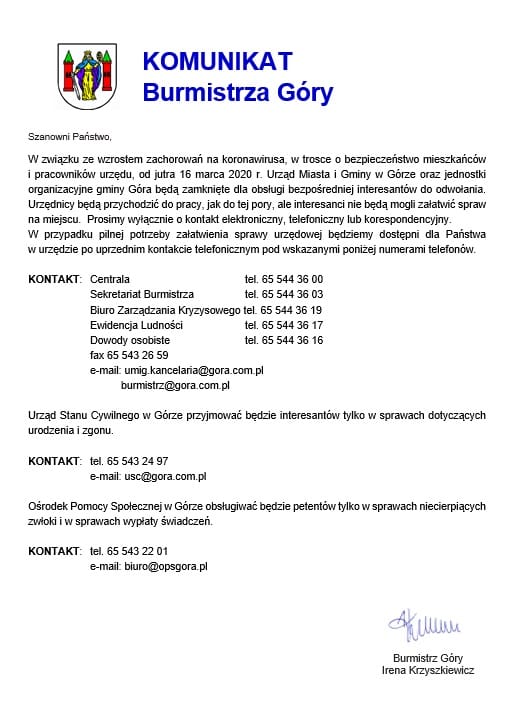 Burmistrz Góry Irena Krzyszkiewicz wydała komunikat do mieszkańców gminy. Poinformowała o zamknięciu placówki dla bezpośredniej obsługi interesantów od 16 marca. Sprawy można załatwiać telefonicznie, mailowo lub korespondencyjnie.