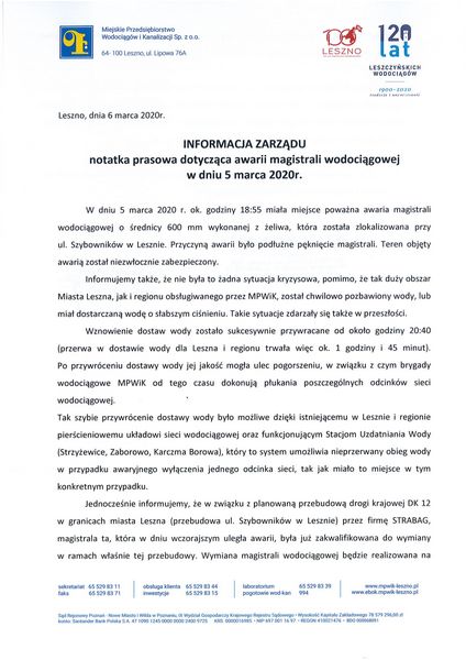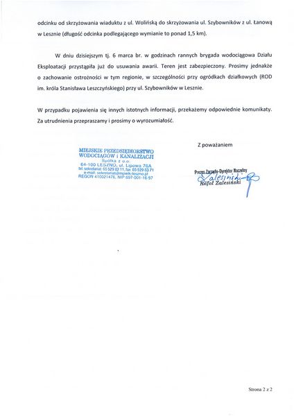 Na prośbę MPWiK Leszno przekazujemy komunikat dotyczący awarii - z 5 marca, na magistrali wodociągowej przy ul. Szybowników w Lesznie, w tym działań podjętych przez MPWiK.