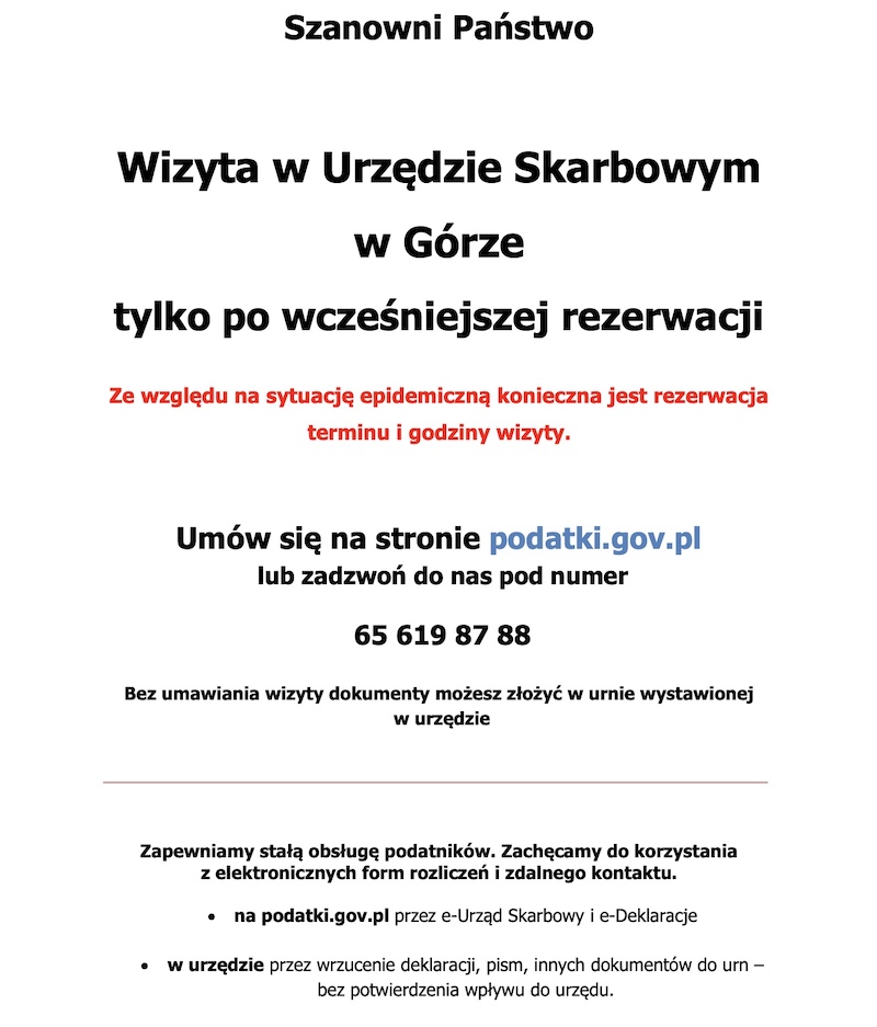 Wizyta w Urzędzie Skarbowym w Górze możliwa tylko po wcześniejszej rezerwacji. Ze względu na sytuację epidemiczną konieczna jest rezerwacja terminu i godziny wizyty.