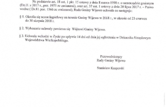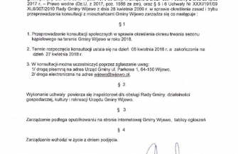 Rada Gminy Wijewo podejmując stosowna uchwałę zobowiązana jest do ustalenia czasu trwania sezonu kąpielowego. W związku z tym wójt gminy Mieczysław Drożdżyński zarządził konsultacje społeczne, czy mieszkańcy gminy zgadzają się na propozycję radnych. W uchwale Rada Gminy Wijewo proponuje by sezon kąpielowy rozpoczął się 23 czerwca, czyli w pierwszą sobotę po zakończeniu roku szkolnego, i potrwał do ostatniego dnia sierpnia. Zgodnie z zarządzeniem wójta konsultacje społeczne potrwają do 27 kwietnia, mieszkańcy swoje uwagi mogą składać pisemnie w formie tradycyjnej przesłanej na adres urzędu, lub elektroniczne. Szczegóły dostępne w materiałach graficznych.