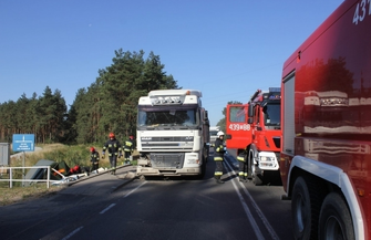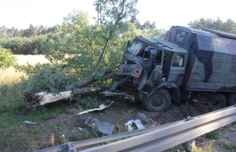 - Strażacy po zabezpieczeniu miejsca zdarzenia, przy pomocy narzędzie hydraulicznych wykonali dostęp do uwięzionej osoby, wyewakuowali z pojazdu i udzieli kwalifikowanej pierwszej pomocy. Po dojeździe Zespołów Ratownictwa Medycznego poszkodowanego przekazano do karetki. W trakcie przygotowywania poszkodowanego kierowcy do transportu, pozostali uczestnicy zdarzenia (dwóch kierowców) zgłosili się do ZRM na badanie – relacjonuje mł. bryg. Rafał Wypych, oficer prasowy KM PSP Leszno. - Ze wstępnych ustaleń wynikało, że przyczyną wypadku mogła być awaria układu hamulcowego wojskowego pojazdu. Uderzył on w poprzedzającą go ciężarówkę wojskową, która następnie zjechała na przeciwny pas ruchu, zahaczyła o samochód ciężarowy, przełamała barierki i wpadła do przydrożnego rowu.