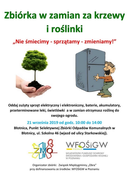 Chcesz pozbyć sie zużytego sprzętu RTV, AGD? Mamy dobrą informację. Związek Międzygminny "Obra" przeprowadzi zbiórkę zużytych sprzętów, baterii czy leków. W zamian otrzymasz roślinę do ogrodu. Zbiórka odbędzie się 21 września od 10:00 do 14:00, w Błotnicy w dwóch punktach. Szczegóły na plakacie.