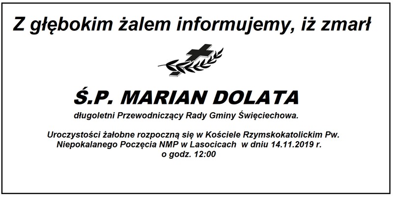 Gmina Święciechowa poinformowała o śmierci Mariana Dolata, wieloletniego Przewodniczącego Rady Gminy Święciechowa. Pogrzeb odbędzie się w kościele w Lasociach o godz. 12:00.
