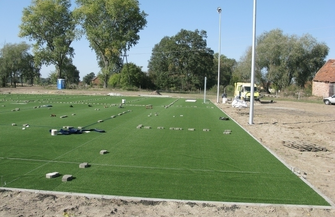 Aktualnie układana jest wierzchnia warstwa boiska ze sztucznej trawy. Zakończono już montaż i przetestowano oświetlenie boiska. Dookoła płyty boiska wykonane zostanie ogrodzenie panelowe o wysokości 4 m, ponadto na boisku znajdą się dwa piłkochwyty o wysokości 6 m zamontowane wzdłuż dwóch krótszych krawędzi boiska.