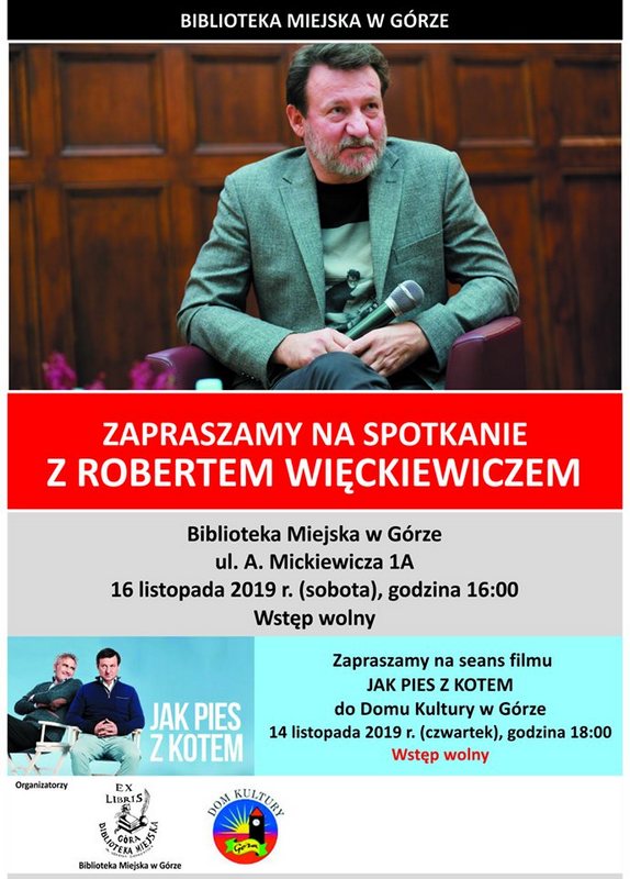 Biblioteka Miejska w Górze zaprasza na spotkanie z aktorem Robertem Więckiewiczem. Odbędzie się w sobotę 16 listopada, o godz. 17:00 w siedzibie biblioteki przy ul. A. Mickiewicza 1A. Wstęp wolny.