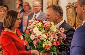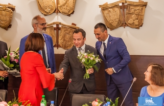 Na ręce starosty, Janusza Frąckowiaka i skarbnika powiatu Bożeny Ćwiklińskiej gratulacje złożyli m. in. przewodniczący Rady Powiatu Andrzej Wita i burmistrz Wolsztyna, Wojciech Lis.
