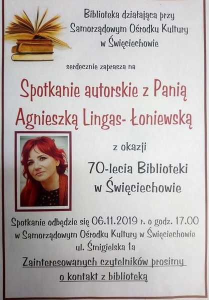 Spotkanie autorskie z Agnieszką Lingas-Łoniewską odbędzie się 6 listopada o godz. 17:00. Biblioteka działająca przy SOK Święciechowa zaprasza do swojej siedziby przy ul. Śmigielskiej 1a.