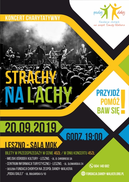 Zespół Strachy na Lachy zagra na koljenym, corocznym koncercie charytatywnym Fundacji chorych na Dandy-Walkera "Podaj dalej". W tym roku koncert poświęcony jest pamięci 35 letniej Joanny, podopiecznej Fundacji. Koncert odbędzie sie 20 września o godz. 20:00, w sali MOK Leszno przy ul. B. Chrobrego 3a.