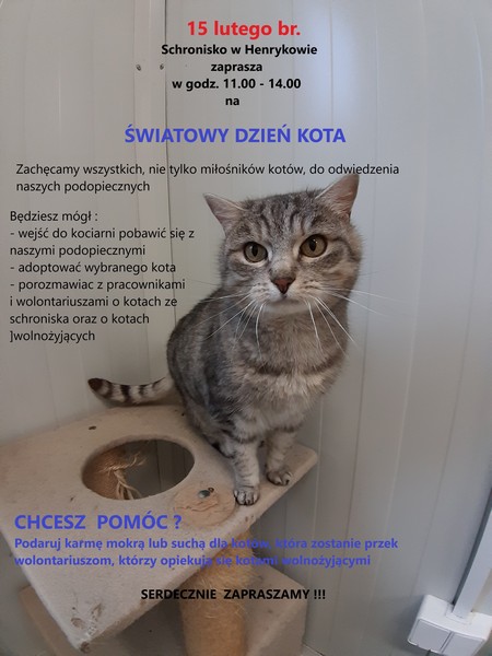 Schronisko w Henrykowie serdecznie zaprasza 15.02.2020 r. w godz. od 11:00 - 14:00 na Światowy Dzień Kota. Zachęcamy wszystkich nie tylko miłośników kotów, do odwiedzenia naszych podopiecznych.