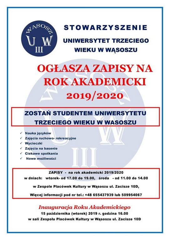 Ważna informacja dla seniorów z Wąsosza i okolic. Mogą zostać studentami Uniwersytetu Trzeciego Wieku. W programie studiów m.in. nauka jeżyków obcych, zajęcia ruchowo-rekreacyjne, wycieczki i spotkania. Stowarzyszenie UTW w Wąsoszu ogłosiło zapisy na rok akademicki 2019/2020.