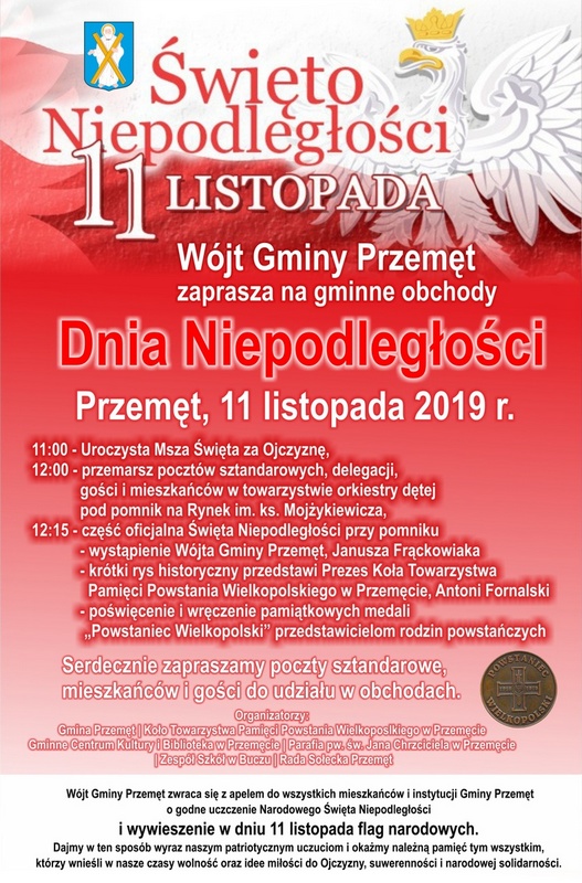 Wójt Gminy Przemęt zaprasza 11 listopada do udziału w obchodach Dnia Niepodległości. Zostanie odprawiona Msza Św, w intencji Ojczyzny. Poczty sztandarowe, delegacje i mieszkańcy przemaszerują pod pomnik na Rynku. Tam rozpocznie się część oficjalna uroczystości.