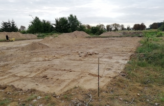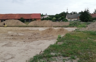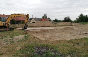 Została zdjęta warstwa urodzajna ziemi, oraz kolejna warstwa gruntu na głębokości 20 cm, która zostanie zastąpiona kruszywem piaskowym w celu przygotowania dna boiska na kolejne warstwy konstrukcyjne.