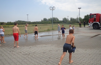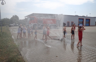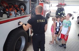 “W upalny czwartek 9 sierpnia wybraliśmy się do Komendy Powiatowej Państwowej Straży Pożarnej w Górze. Ilość atrakcji zafundowana przez strażaków była tak ogromna, że dzieci biorące udział w warsztatach nie wiedziały do której atrakcji podchodzić najpierw. Warsztaty rozpoczęły się wykładem pana Krzysztofa Mastalerza, który także oprowadził nas po całej strażnicy i pozwolił bliżej przyjrzeć się pracy górowskiej jednostki. Na początku wysłuchaliśmy kilku słów o historii zabytkowego wozu, który ciągnięty był przez konie a zasilanie pomp wodnych odbywało się za pomocą pracy rąk ludzi. Mięliśmy także okazję przyglądnąć się zabytkowemu już edyktowi pochodzącemu z 1775 roku, który posiada strażnica w Górze. Później przyszedł czas na odwiedziny w dyspozytorni. Mięliśmy okazję zobaczyć i dotknąć radiotelefonów wykorzystywanych przez dyspozytora odbierającego zgłoszenie i komunikującego się z poszczególnymi jednostkami czy punktami przeciwpożarowymi. Dowiedzieliśmy się w jaki sposób straż dociera do pożarów w lasach a także, którym jednostkom pomaga w razie pożarów w ościennych powiatach. Po kilku minutach teorii przeszliśmy do bardziej praktycznych czynności. Pan Krzysztof zaprowadził nas do stajni strażaków, z której wyjeżdżają swoimi czerwonymi mustangami, aby nas ratować. Każdy młody uczestnik warsztatów mógł wejść na podest strażackiego wozu, zasiąść za kierownicą a także z dokładnością zapoznać się z wyposażeniem ratowniczo-gaśniczym. Nie zabrakło testów dźwięków wydobywających się z wozów jadących na akcję i przymierzania części garderoby strażaków. Po godzinie przyszedł czas na to co dzieci lubią najbardziej - zabawy z wodą. Panowie strażacy przygotowali dla najmłodszych konkurencje oparte o trafianie strumieniem wody do celu. Wykonanie zadania nie należało do najłatwiejszych z powodu trudności w opanowaniu ciśnienia strumienia wody w wężu. Po chwili, kiedy każdy mógł spróbować swoich sił przy wężu strażackim, panowie strażacy uraczyli nas kurtyną wodną, która pozwoliła choć na chwilę schłodzić się w ten upalny dzień. Zaprezentowali także działanie pompy wodnej zamontowanej na burcie wozu strażackiego, którą także lekko nas ochłodzili. Po posiłku przyszedł czas na krótki mecz piłki nożnej i powrót do Domu Kultury. Mamy nadzieję, że każdy młody uczestnik biorący udział w dzisiejszych warsztatach wrócił do domu pełen wrażeń i zadowolenia a panom strażakom jeszcze raz dziękujemy za przygotowanie jednych z najciekawszych warsztatów odbywających się tego lata przy Domu Kultury w Górze w ramach dni otwartych naszej placówki. “