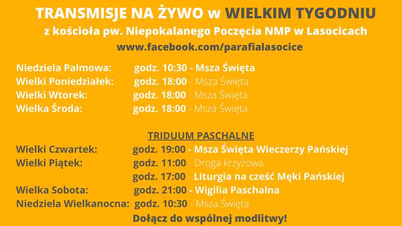 W tym roku Święta Wielkanocne spędzimy w domach. Parafia pw. Niepokalanego Poczęcia NMP w Lasocicach zaprasza na codzienne tranmisje Mszy Świętych na żywo. Na grafice można zapoznać się z godzinami transmitowanych Mszy Świętych w Wielkim Tygodniu oraz w Wielkanoc.