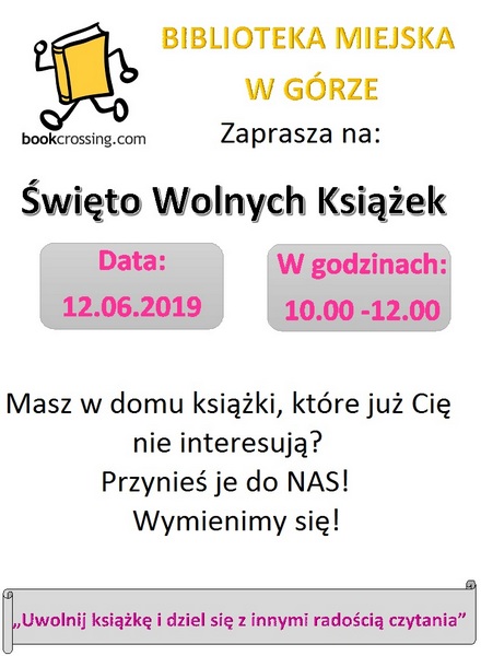 12 czerwca Biblioteka Miejska w Górze, zaprasza na święto Wolnych Książek. Masz książkę w domu, która nie wzbudza już zainteresowania? Nie martw się, przynieś ją do bibioteki w środę, w godzinach 10:00-12:00. Drogi czytelniku, będziesz mógł się wymienić.