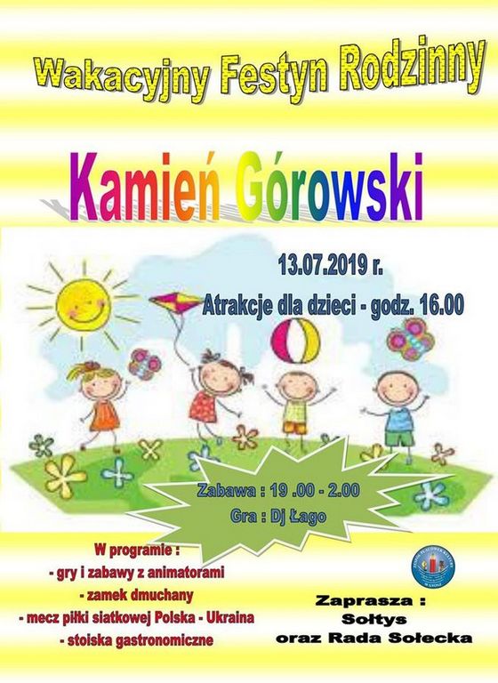 Sołtys wraz z Radą Solecką zapraszają na Wakacyjny Festyn Rodzinny. Odbędzie się 13 lipca w Kamieniu Górowskim, od godz. 16:00. Zabawę taneczną poprowadzi DJ Łago od 19:00.