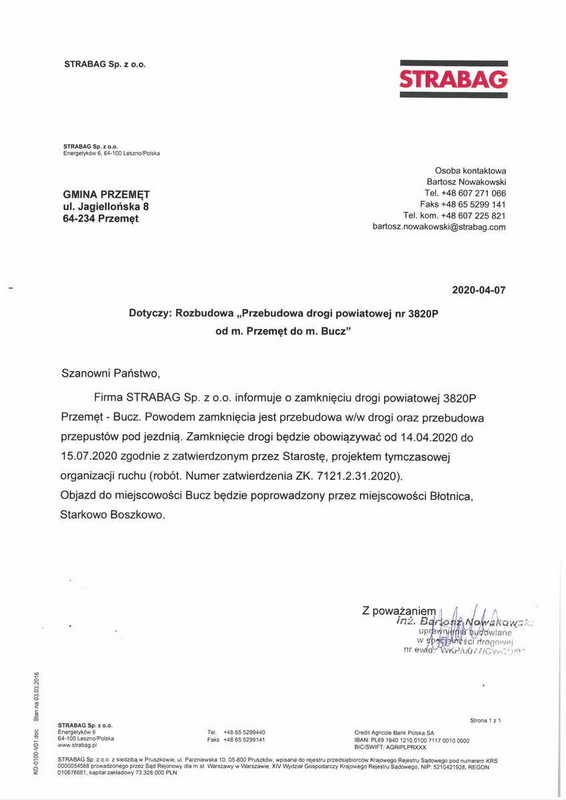 Od 14 kwietnia zamknięto drogę powiatową 3820P Przemęt - Bucz, z powodu przebudowy. Zamknięcie potrwa do 15 lipca. Objazd do miejscowości Bucz przez Błotnicę, Starkowo Boszkowo.