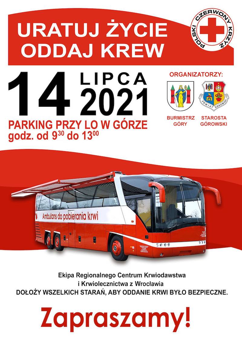 Zostań Honorowym Dawcą Krwi. Starosta Górowski Anna Kolibek oraz Burmistrz Góry Irena Krzyszkiewicz zapraszają 14 lipca 2021 r. na parking obok Liceum Ogólnokształcącego im. Adama Mickiewicza w Górze, przy ul. Szkolnej 1.