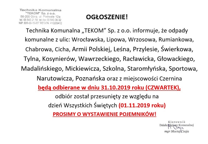 UMiG Góra poinformował o zmianie terminu odbioru odpadów komunalnych. Zmiana jest związana z dniem Wszystkich Świętych. Treść komunikatu publikujemy poniżej. Urząd przypomina również o zakazie spalania odpadów komunalnych w piecach.