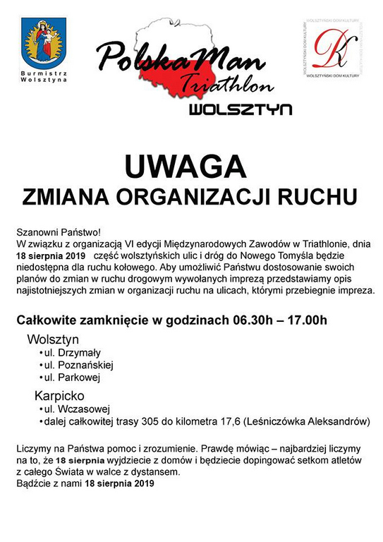 W godzinach 6:30 - 17:00 będą zamknięte ulice: Drzymały, Poznańska i Parkowa w Wolsztynie. W Karpicku nie przejedziemy ul. Wczasową oraz trasą drogi 305 do 17,6 km (w Leśniczówka Aleksandrów). Organizatorzy przepraszają za utrudnienia i liczą na zrozumienie. Liczą, że mieszkańcy przyjdą na trasę zawodów i będą zagrzewać do walki zawodników.