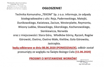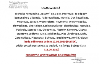 Technika Komunalna "TEKOM" Sp. z o.o. informuje o zmianie terminu obioru odpadów komunalnych, biodegradowalnych i segregowanych. Wszystko przez przypadające na czwartek (11.06.2020) Święto Bożego Ciała.