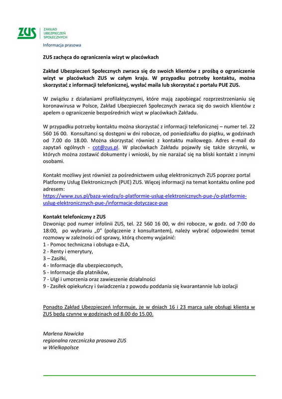 ZUS wydał informację prasową, w której prosi klientów o ograniczenie wizyt w placówkach w całym kraju. W przypadku potrzeby kontaktu, należy skorzystać z infolinii, wysłać maila lub skorzystać z portalu PUE ZUS.